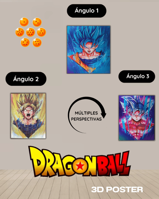 El 3D POSTER- DRAGON BALL: tiene 3 imágenes de GOKU de tres de sus mejores momentos.