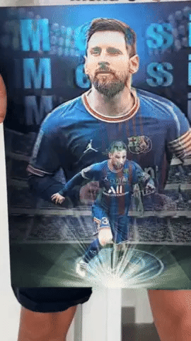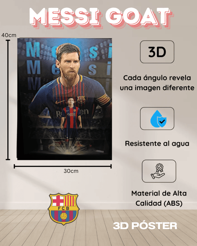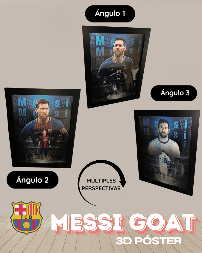 El 3D POSTER- MESSI GOAT: tiene 3 imágenes de MESSI de tres de sus mejores equipos.