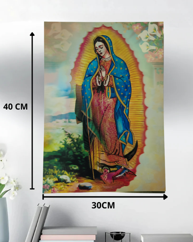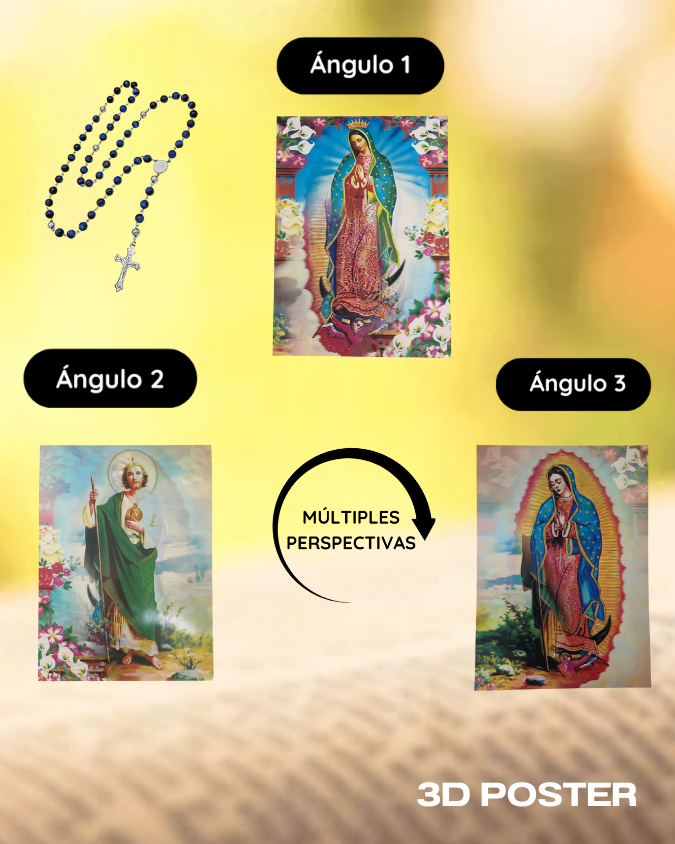 Este póster 3D de edición limitada cambia según el ángulo de visión, mostrando tres imágenes con profundidad y detalle. Un diseño cuidado que aporta presencia y espiritualidad al espacio, ideal para regalar o tener en tu hogar y recordar el amor, la protección y vivir la esperanza!